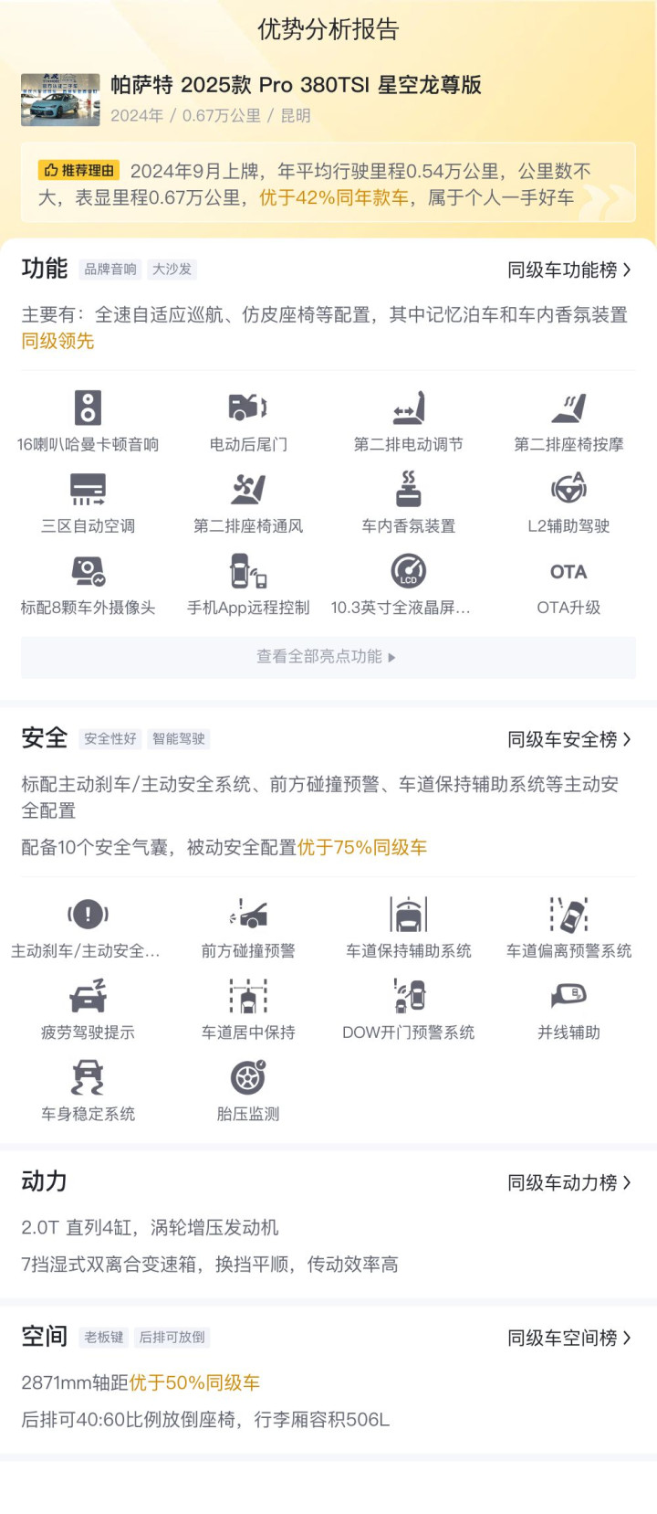 这款帕萨特 2025款 Pro 380TSI 星空龙尊版上牌地为云南大理,上牌日期2024年09月,表显里程6.70万公里,新车含税价26.11万,二手车报价17.98万,过户次数显示该车辆尚未有过户记录,这通常意味着车辆自购买以来一直由初始车主使用,车源地为云南昆明。