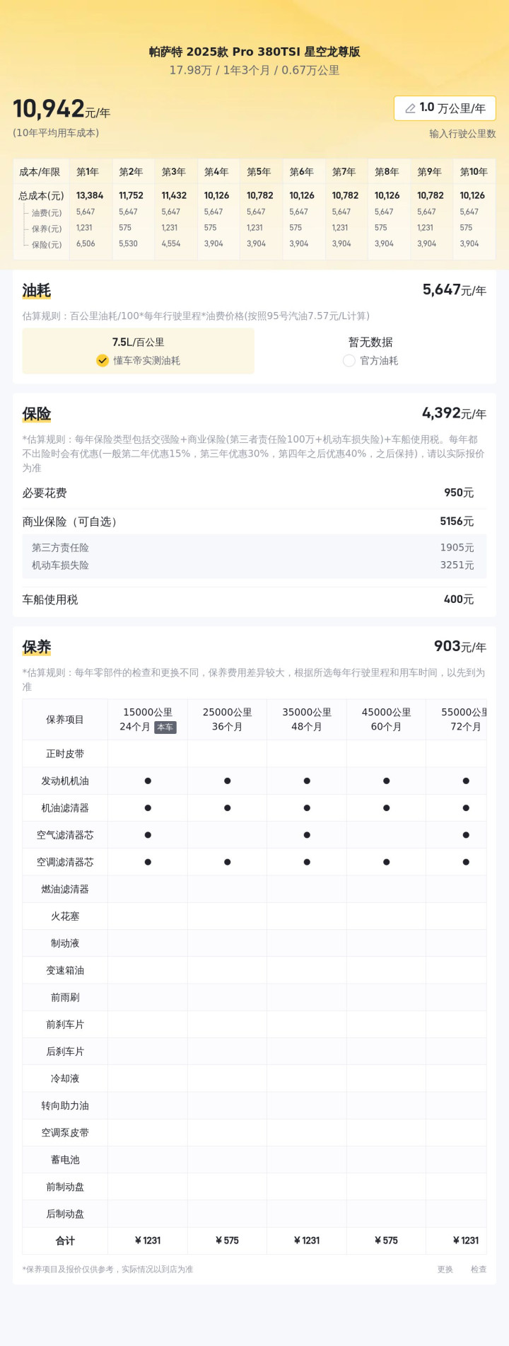这款车的综合油耗为6.87升/百公里,按当前油价计算,每百公里油费大约为56元,每年保险费用大约为4388元,保养费用大约为1888元,这些都属于正常的用车开销。